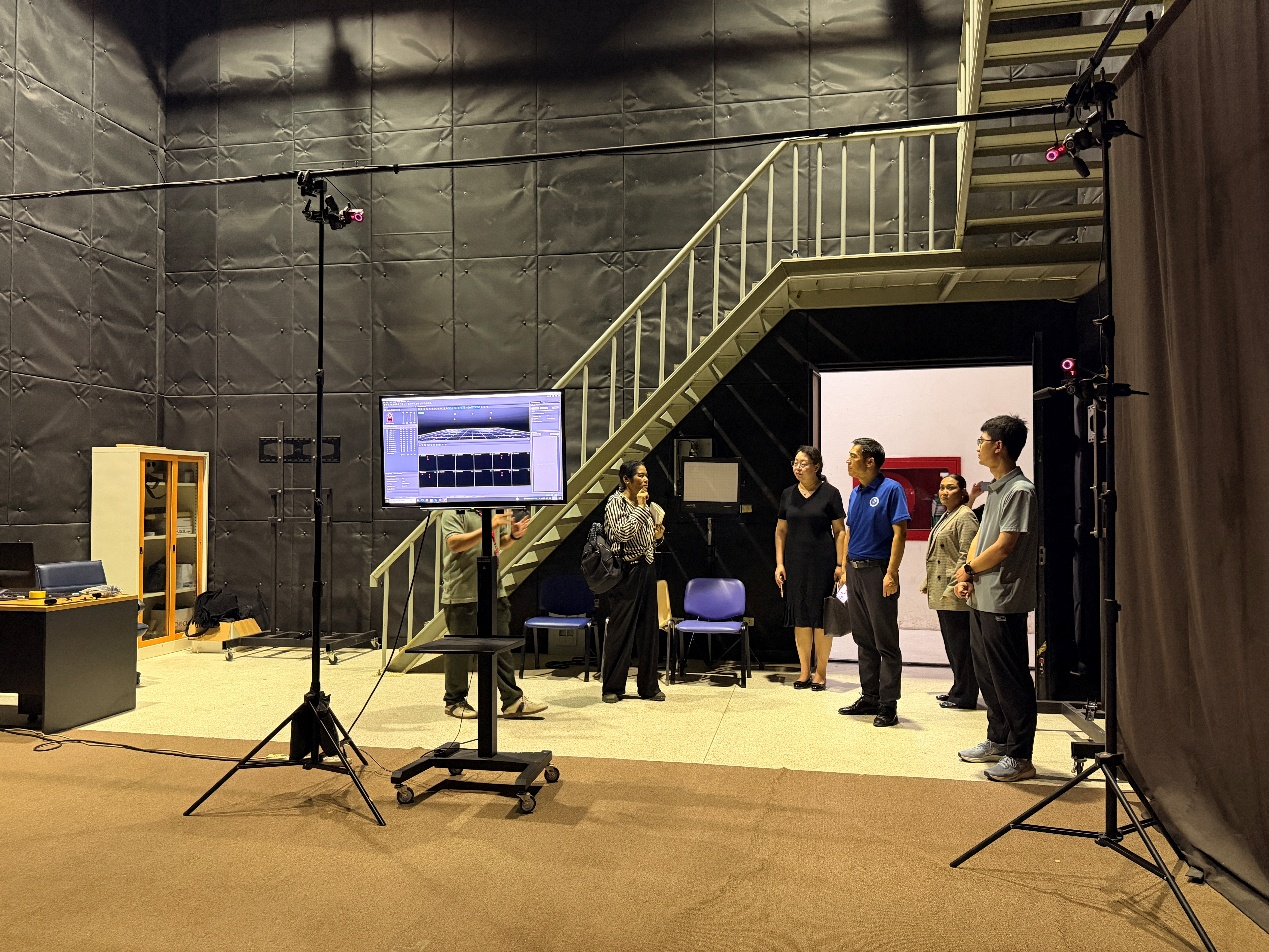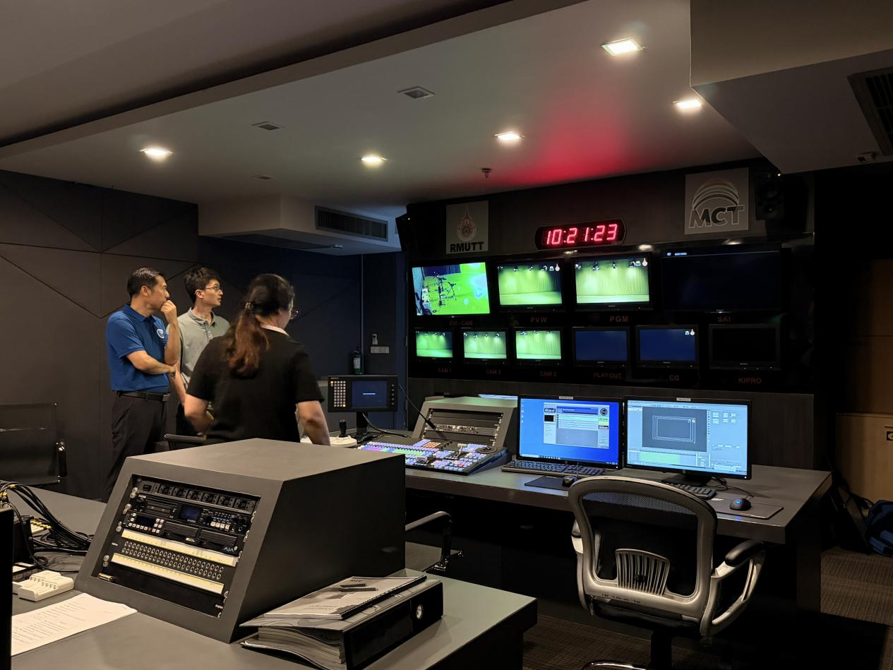 在RMUTT大众传播技术学院副院长及专业负责人的陪同下,代表团实地参观了学院多个核心教学与实践场所。泰方详细展示了包括专业录音棚、7.1声道混音工作室、影视摄像实验室、多媒体编辑中心在内的全流程教学设施。实验室内配备的先进设备,如专业摄像机、调音台、灯光系统及虚拟制作技术,展现了学院强调“理论与实践深度融合”的教学理念。泰方在实践教学上的投入与体系化建设令人印象深刻。尤其是在视听内容制作、数字媒体技术创新方面的实验室配置,与beat365官网大数据与人工智能学院在智能媒体、游戏建模等方向的发展规划高度契合。双方在课程衔接、实践项目联合开发上拥有广阔空间。