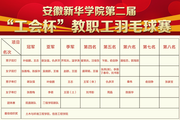经过两个星期的激烈角逐,产业处叶俊鹏、教务处王志和土木与环境工程学院张雅梅、陈振华分别摘得男子、女子双打桂冠,土木与环境工程学院谢汝强、张雅梅蝉联男子、女子单打冠军。院直联队和二级学院联队分别获得团体赛冠亚军。土木与环境工程学院与信息工程学院分工会获得最佳组织奖。