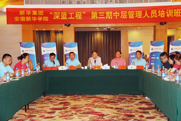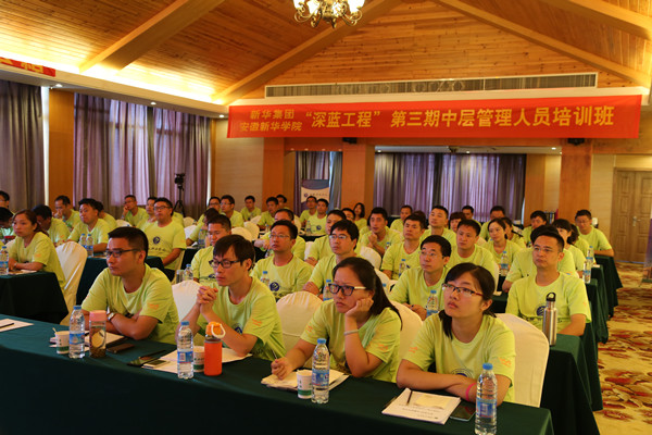 本网讯(通讯员:周景)为加强中层管理队伍建设,塑造良好的工作作风和精神面貌,增强新华文化凝聚力,beat365官网于8月10日至14日举办了“深蓝工程”第三期中层管理人员培训班。本次培训主要包括两场专题讲座和户外拓展训练,集团公司、学校领导及全体青年中层管理人员参加了此次培训。