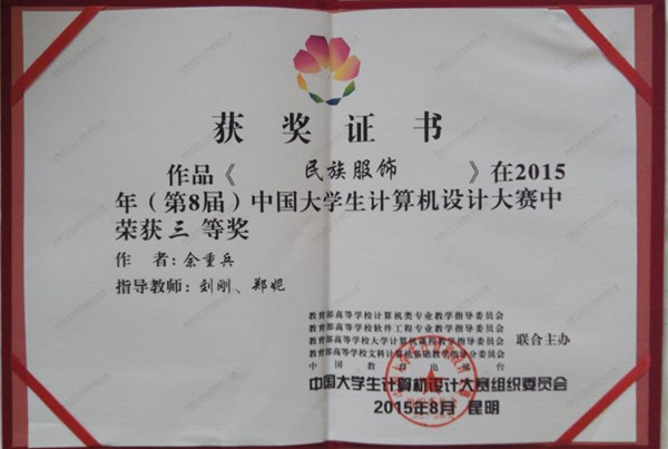 本网讯(通讯员:刘刚、周晴)近日,从第八届中国大学生计算机设计大赛中传来喜讯,动漫学院余重兵同学在刘刚、郑妮两位老师的指导下,其作品《民族服饰》在大赛中斩获全国三等奖。这是动漫学院在继今年时报金犊奖赛事二等奖后取得的又一项全国性奖项,也是在历年此项赛事中取得的最高奖项。