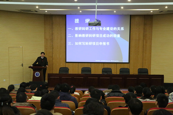 冯德连从教研、科研工作与学科专业建设的关系讲起,谈到教研科研工作与教学、教师职业发展和学校发展的三个结合,以及影响教研、科研项目成功的因素等内容,重点阐述金点子如何形成、如何巧妙包装和艺术性设计等一系列成功的经验,并提出“早干”、“多干”、“快干”和“细心”、“用心”、“恒心”几个关键词。最后,冯德连以自己申报国家社科基金等项目为例谈如何撰写项目申报书,从选题、科学论证、研究内容、思路方法与创新之处等诸多方面详细讲述了申请书撰写过程中的关键点和注意事项。