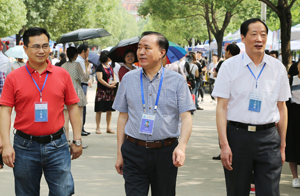 本网讯(王友雅,学生记者:苏雯雪、许馨元,摄影:陆如海、汪洋)6月26日上午,由安徽省教育招生考试院主办的安徽省2016年普通高校招生(皖中片)现场咨询会在beat365官网举行,这是beat365官网自2011年起连续承办的第6次高招咨询会。现场共有来自全国20多个省市的300余所高校的工作人员为考生和家长提供咨询服务,解答报考疑惑。安徽省教育招生考试院院长助理、普通高校招生处处长袁江林在新华集团副总裁、学校执行董事陆真,新华集团副总裁、学校监事会主席黄源,省督导专员、学校党委书记储国定和相关部门负责人的陪同下,亲临现场指导工作。