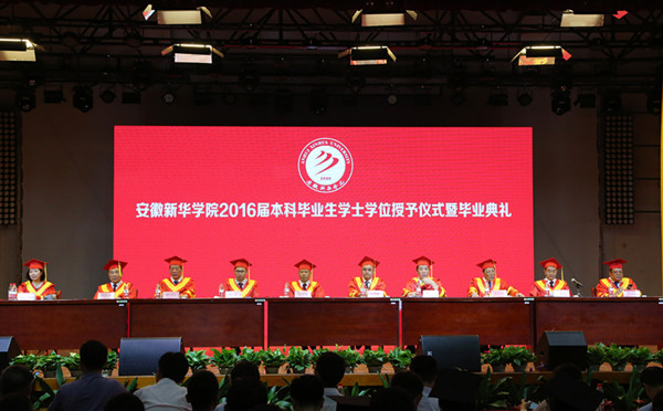 新华集团董事长吴俊保,集团副总裁、学校副董事长王孝武,集团副总裁、学校执行董事陆真,集团副总裁、学校监事会主席黄源,省督导专员、学校党委书记储国定,校长石秀和,副校长杨世国、马凤余、王可、李金星与毕业生代表一一握手,为他们颁发学士学位证书、扶正流苏,祝贺他们顺利完成大学四年的学业。
