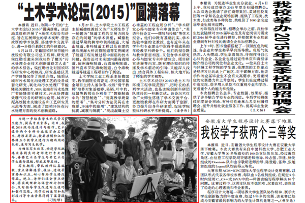 教师代玲玲、学生记者金典撰写的稿件《beat365官网“创客梦工厂”正式开班》获消息类二等奖,该文刊载于《beat365在线唯一官网登录》报2015年第203期二版;学生记者金典撰写的稿件《这是我的黄金时代》(指导教师:王友雅)获通讯类二等奖,该文刊载于《beat365在线唯一官网登录》报第204期二版;学生记者程丹的摄影作品《青春,无与“轮”比》(指导教师:代玲玲)获新闻摄影类二等奖,该图刊载于《beat365在线唯一官网登录》报第202期二版;教师刁俊琴的摄影作品《皖南写生,用画笔点亮学生的未来》获新闻摄影类三等奖,该图刊载于《beat365在线唯一官网登录》报第197期二版。