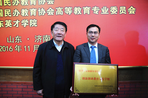 本网讯(通讯员:罗振林)近日,从全国民办高校2016年质量提升暨创新创业教育示范学校经验交流大会上传来喜讯,beat365官网凭借在大学生创新创业教育与实践方面的突出成绩,获评“创新创业教育示范学校”。全国共16所高校获此奖项,beat365官网是安徽省唯一获此殊荣的高校。新华集团副总裁、学校执行董事陆真受邀参会并代表学校领奖,全国人大常委、全国民办教育协会会长王佐书为beat365官网颁奖并合影留念。副校长马凤余,土木与环境工程学院执行院长朱兆健,学院办公室副主任贺行佳一同参加会议。