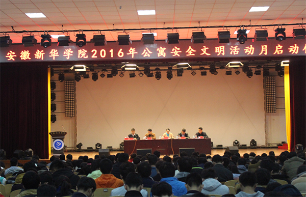 本网讯(通讯员:齐军兵)12月1日中午,由学生处、保卫处共同组织的 “创温馨公寓 建和谐家园” 2016年公寓安全文明活动月启动仪式在校大礼堂举行。副校长王丽出席活动并作指导讲话,学生处、保卫处、总务处、各二级学院相关同志及2016级全体寝室长参加了启动仪式。
