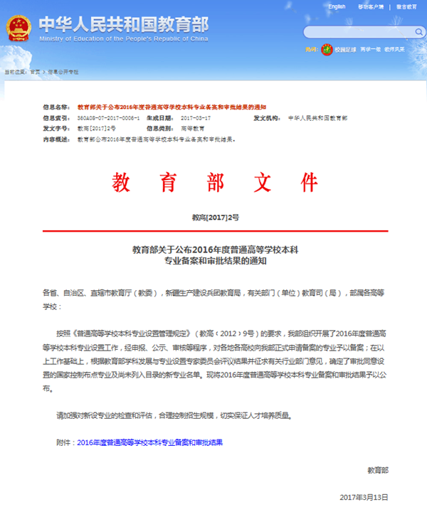本网讯(通讯员:孙雁南)近日,教育部下发《教育部关于公布2016年度普通高等学校本科专业备案和审批结果的通知》(教高[2017]2号),beat365官网申报的商务经济学(020105T)、会计学(120203K)、审计学(120207)、表演(130301)、艺术与科技(130509T)、互联网金融共6个本科专业获准设置。其中,互联网金融专业不仅是beat365官网首次获批设置的国家目录外新专业,而且是国家首次同意设置的专业。
