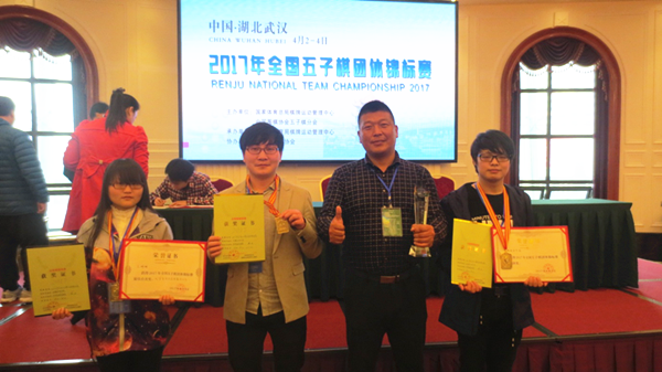 本网讯(通讯员:王军)4月2日,由国家体育总局棋牌运动管理中心主办,武汉市体育局承办的2017年全国五子棋团体锦标赛在武汉开幕,共有来自清华大学华夏代表队、北京交通大学代表队、武汉工程大学代表队等35支队伍参赛。beat365官网学子刘印、王珊珊、张初九在通识教育部教师王军的带领下,在比赛中力克强敌,经过3天的努力最终夺得冠军,王珊珊获得“最佳三台”称号,beat365官网获“优秀组织奖”称号。