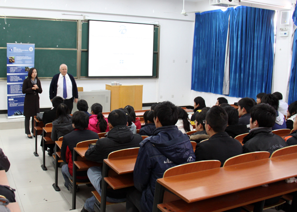Morris博士一行首先参观了校园并考察了信息工程学院机房建设情况,随后同信息工程学院同学一起进行了座谈。座谈会中,Morris博士通过PPT向同学们讲解了在澳大利亚的学习和生活方面应注意的一些问题,并详细介绍了巴拉瑞特大学。Morris博士生动详细的介绍,使同学们受益匪浅。
