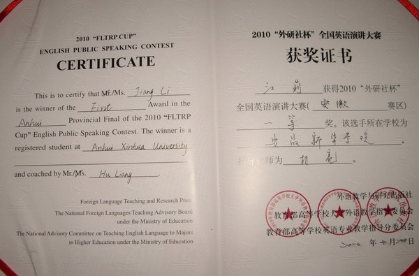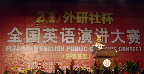 由外语教学与研究出版社、教育部高等学校大学外语教学指导委员会、教育部高等学校英语专业教学指导分委员会、安徽省大学外语教学研究会主办,安庆师范学院承办的2010“外研社杯”全国英语演讲大赛安徽赛区复赛经过两天的激烈角逐,于10月24日落下帷幕。我院08级英语专业学生江莉以纯正的发音,流畅的演说和雄辩的口才征服了在场所有评委和嘉宾,荣获大赛一等奖,丁蕾同学也以优异的成绩,荣获大赛优胜奖。在我院喜迎10年校庆之际,献上了一份大礼。