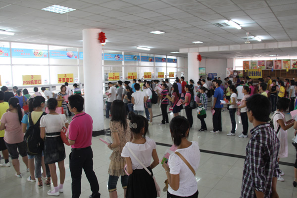8点之后,翰林食堂一楼收费大厅的各窗口陆续开放,新生报到注册点挤满了新生和家长,新生们在工作人员的引导下进入缴费区排队等候,缴费现场由保卫处维持秩序。