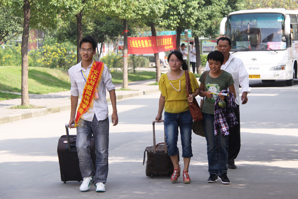 一进学校大门,就有穿着校服的学生会人员带领新生报名,对于不是本学院的新生,会帮他带到其所属的学院。记者采访了一名电子通信工程学院学生会接待人员李凯旋,他说:“每天早上6:50就要到岗,一直工作到晚上7点,每个接待人员一上午最多可以迎接3名新生。有些新生在晚上才到校,此时学校的报道工作都已经停止了,学校有专门宿舍给来学校较晚的新生住,我们会把他们带到临时住宿的地方,把联系方式留给他们,第二天再办理缴费手续。”李凯旋见一家长进了学校,立马上向家长问好然后积极的接过手上的行李,带着他们去办理入学手续。路上,李凯旋向他们介绍学校的各个方面。经过图书馆的时候,他介绍到:“这是我们学校的图书馆,里面藏书很多,平时下课可以来这里看书学习。”胡叔叔说:“你们的服务让刚来的新生和家长省去了很多麻烦,如果没有你们的帮助,估计我们把手续办完要花很长时间。”