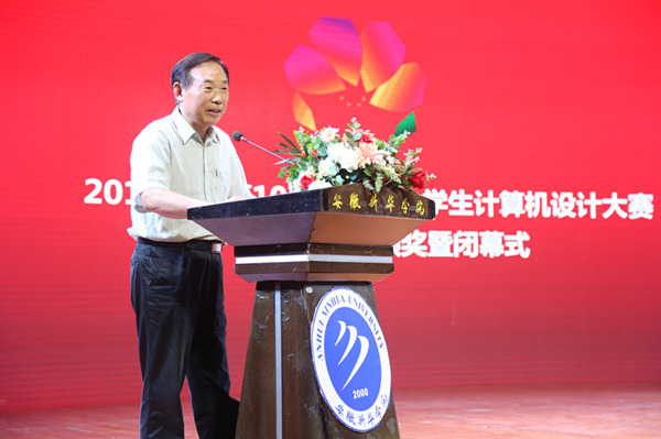 杨世国在闭幕式上致辞,他首先向获奖选手表示祝贺。他说,中国大学生计算机设计大赛不仅是一个竞赛的平台,更是学习和交流的平台,对鼓励大学生创新、创意、创业,激发大学生学习知识技能的兴趣和潜能,锻炼大学生实践能力具有积极的推动作用。