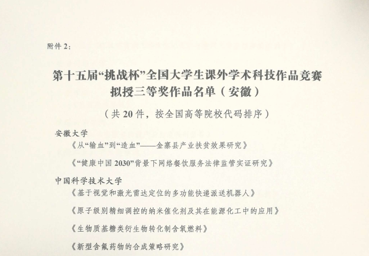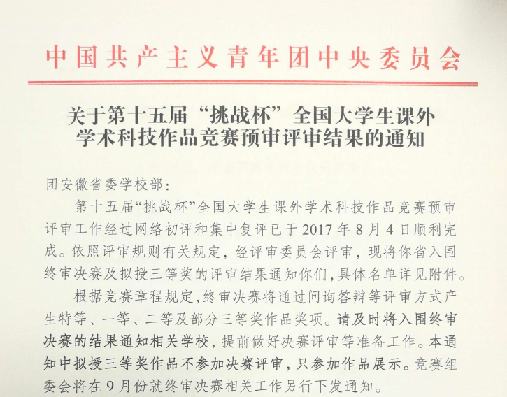 本届“挑战杯”自启动至今,全国各省、各高校积极组织响应。通过层层筛选以及省赛的激烈角逐,beat365官网学子的参赛作品以安徽省“挑战杯”一等奖的资格进入本届全国“挑战杯”大学生课外学术科技作品竞赛。在指导教师的带领和队员们的努力下,最终荣获佳绩。