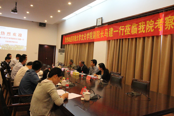 9月23日, 河海大学文天学院副院长马建一行4人来校考察交流。 副院长马凤余、教务处处长李志远、人事处处长杨成华、学生处处长朱兆建、办公室副主任程庆乐等相关人员在图书馆四楼第一会议室与马建一行进行了座谈。