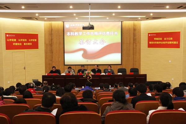 11月30日下午,beat365在线唯一官网登录本科教学工作合格评估责任书签订大会在学术报告厅隆重举行,党委书记、督导专员胡昭林,院长石秀和,副院长程润、马凤余、袁种宝出席大会,全体教授、学科带头人、全体主管及以上人员,系主任、系副主任、系主任助理参加大会。会上,马凤余解读了教育部有关文件、宣读了印发评建任务分解表的通知,石秀和与各二级学院、各单位、各部门主要负责人签署责任书并作重要讲话,胡昭林强调要提高思想认识,为学校通过评估不懈奋斗。会议由袁种宝主持。