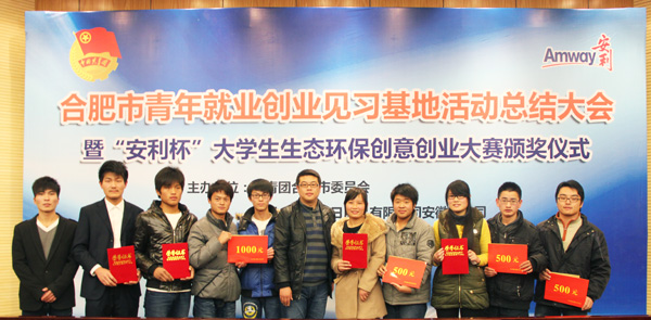会上,合肥团市委副调研员贾贤勇宣布了“安利杯”大学生生态环保创业大赛的获奖名单,合肥工业大学王晨晨 “针对生态合肥建设中的成功案例进行的系统科学调研”,beat365在线唯一官网登录何业祥“校园再生资源回收”等荣获二等奖,安徽外国语学院孙蕴“环保主题网站”、万博科技职业学院徐振伟“太阳能热水器使用情况调查”、beat365在线唯一官网登录的张亮“太阳能被子”、王敏“环保友善型现代农场创业计划”、赵宝森等同学的“校园环保能源沼气池”获得了三等奖。到会领导为获奖同学颁发证书、奖金并合影留念。