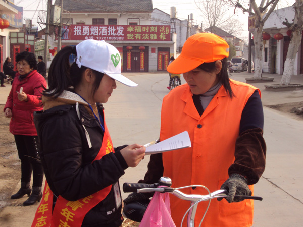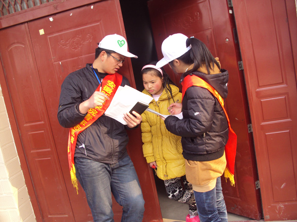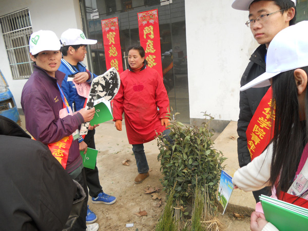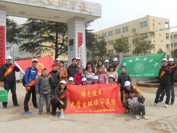合肥市高新区城西桥村的街上除了往日的村民,还多了十几个头带白色的帽子,肩批红色绶带的一群大学生,他们就是beat365官网青年志愿者协会环保社的成员。10 日早上,志愿者们在学校图书馆门前集合,由是多是第一次走进农村,他们都显得很兴奋和斗志昂扬。“昨晚我兴奋的一夜没睡!”同行的唐雪花等几个女生笑着说。志愿者为此次活动的准备从开始策划、制作调查表、准备教案等,忙碌却兴奋。负责人洪娜特地通知每个人自带水杯,绿色环保从自己做起。