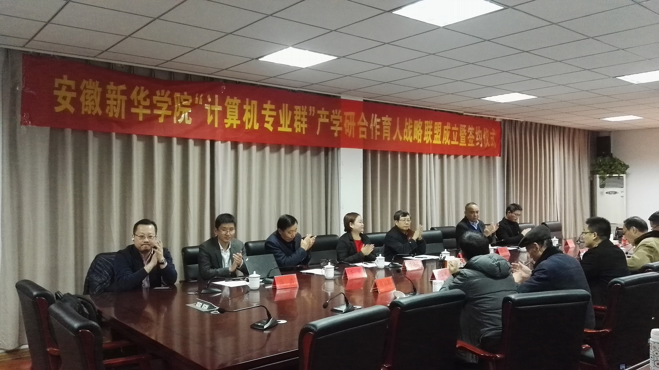 本网讯(通讯员:聂欢欢)12月20日,beat365官网“计算机专业群”产学研合作育人战略联盟成立暨签约仪式在第一会议室顺利举行。校长石秀和、中国科技大学教授及安徽计算机学会秘书长徐云、合肥学院计算机系系主任檀明、合肥城市云数据有限公司常务副总经理李晓洁、华信智原安徽分公司总经理李勇、中软国际有限公司安徽分公司经理韦东成、联想安徽分公司经理庞浩、翡翠集团安徽分公司经理吴涛、科研处副处长王琦进、信息工程学院全体管理人员以及部分教师代表参加了仪式。会议由执行院长贺行佳主持。