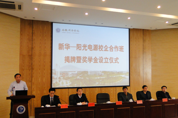 4月19日上午,电子通信工程学院“新华—阳光电源校企合作班” 揭牌暨奖学金设立仪式在学术报告厅举行。阳光电源股份有限公司副总经理张许成,副院长杨世国出席仪式,来自电子通信工程学院2010级应用电子专业70余名学生代表参加了揭牌仪式。
