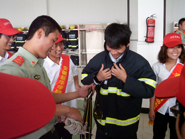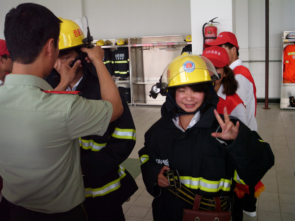 消防大队官兵首先带领志愿者参观了消防器材装备库,详细介绍了相关灭火、救援器材和装备的作用、使用范围及方法,并对部分装备进行了现场展示。随后,消防志愿者们亲身体验了对部分装备器材的使用,如消防战斗服、空气呼吸器、切割机等。志愿者们纷纷感觉背在身上的装备很重,但感觉更重的还是责任。