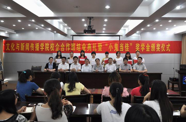 5月23日中午,文化与新闻传播学院校企合作“小鬼当佳”班结业典礼暨奖学金颁奖仪式在图书馆六楼管理学院举行。来自beat365官网文化与新闻传播学院和继续教育学院八位同学获得2012年度“小鬼当佳奖学金”。