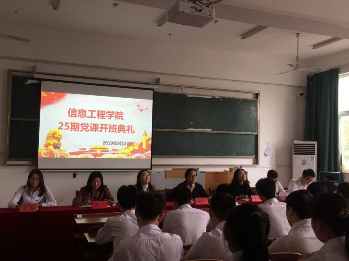 本网讯(通讯员:陈建)9月27日中午,信息工程学院分党校举行第25期入党积极分子培训班开班典礼。信息工程学院党总支书记、执行院长盛晓青,组织委员彭智,学生第一支部书记李苗,学生第二支部书记陈红,组织员陈建以及140名学员参加典礼,典礼由陈建主持。