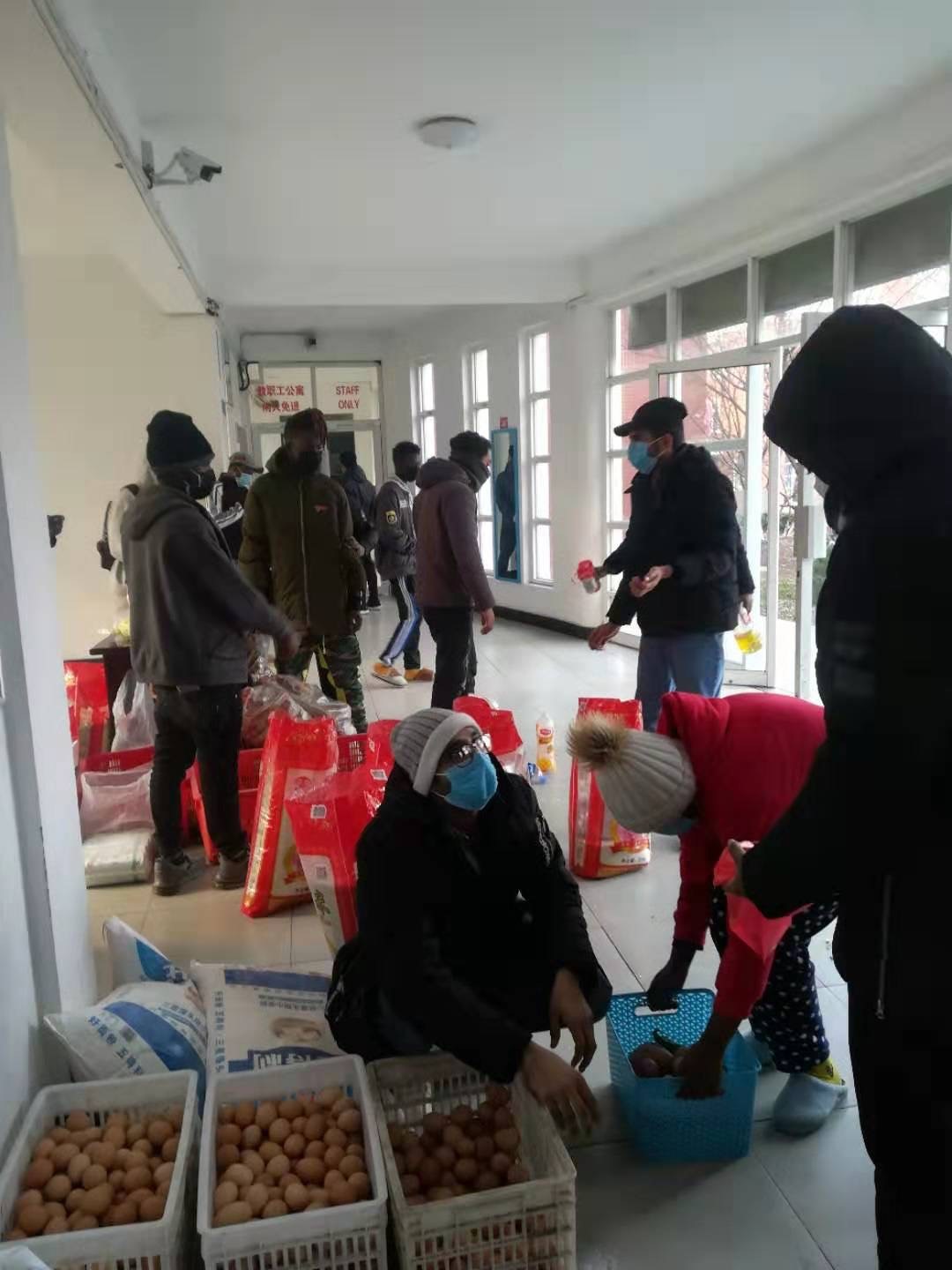 在学校领导的关心爱护下,1月30日,学校专门为在校留学生分发了米,面,鸡蛋等食品。学校超市也在极其困难的条件下,专门为留学生开放了两次,为他们购买生活必需品。值班食堂在物资短缺的情况,每天制作丰富营养的食品提供给留学生,甚至专门为穆斯林学生提供了他们国家风俗的食物。