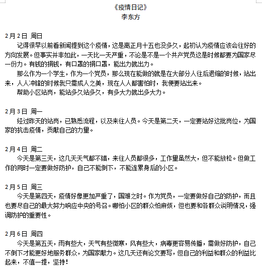 外国语学院党总支学生第一支部党员李东方,主动报名成为自家小区站岗执勤的志愿者。不仅要不厌其烦的完成往来人员非必要出行的劝返工作,还要挨家挨户进行疫情排查。在对小区的每一家住户进行健康摸底时,李东方也曾遭遇过他人的不解和排斥,他在日记里这样写道:“虽然有的群众语气不好,但作为党员一定要耐心的向群众解释和核实……希望疫情可以早些结束,人民群众平安。”