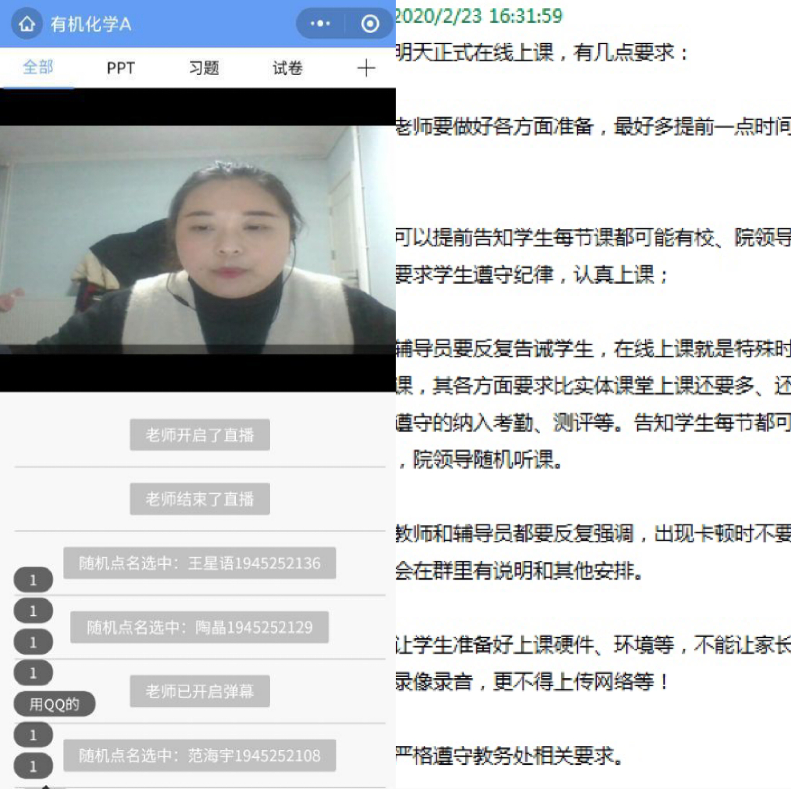 积极交流探索,提高线上教学质量。根据学科和专业特点,学院领导组织全体老师针对线上课程资源、线上直播讲课、课后辅导等开展讨论研究,指导各教师充分利用雨课堂、智慧树等线上资源,灵活运用QQ、微信等多元化网络工具,开展形式多样的线上课程教学。教师们积极响应,积极沟通,互帮互学,立足已有教学资源,积极探索提高教学质量和教学效果的新措施新方法,并分享优秀的教学备课课件,共同提高线上教学的质量。