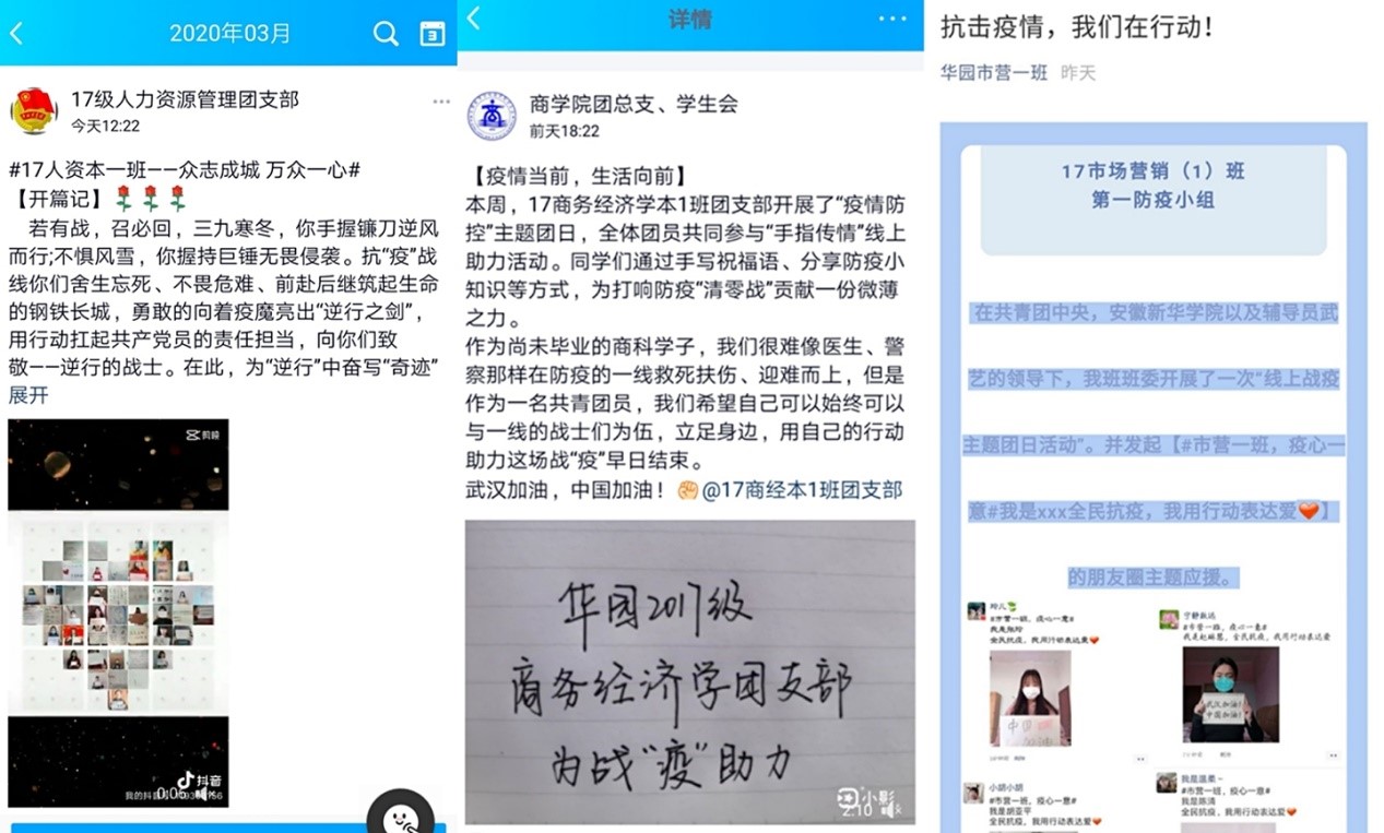 广大团员们通过自己的朋友圈、QQ、微博等途径,积极转发官方媒体发布的各类疫情信息、健康防护知识,占领网上舆论高地。响应青年志愿者“手指传情”的号召,以手机和网络为工具,自发承担网络志愿服务工作,影响自己的“朋友圈”,使身边人都能理性防疫。