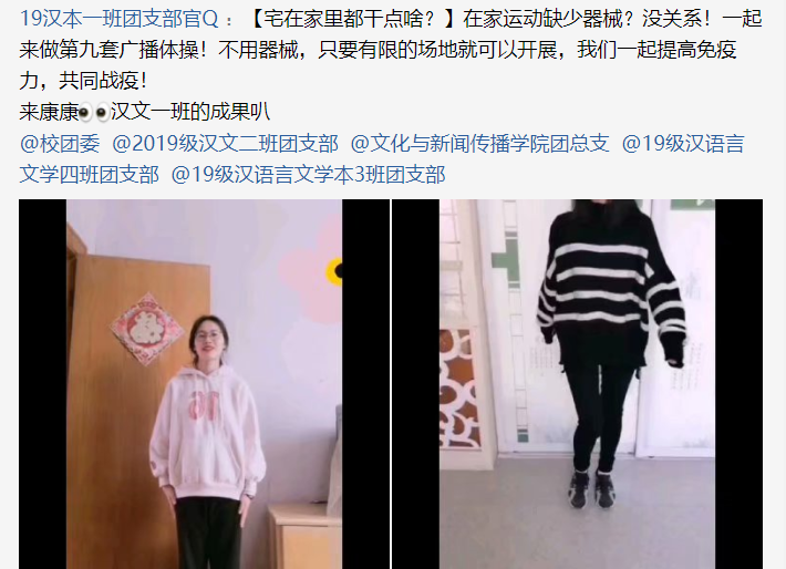 为了让同学们在居家学习的同时可以得到锻炼,提高自身免疫力,经网络投票挑选了同学们喜爱的运动方式“第九套广播体操”。号召团员青年加强体育锻炼,以良好的身体素质投入到学习中。同学们纷纷拍摄锻炼短视频,在QQ、抖音等平台进行展示。各班级利用所学,将同学们的视频进行剪辑,留作纪念。
