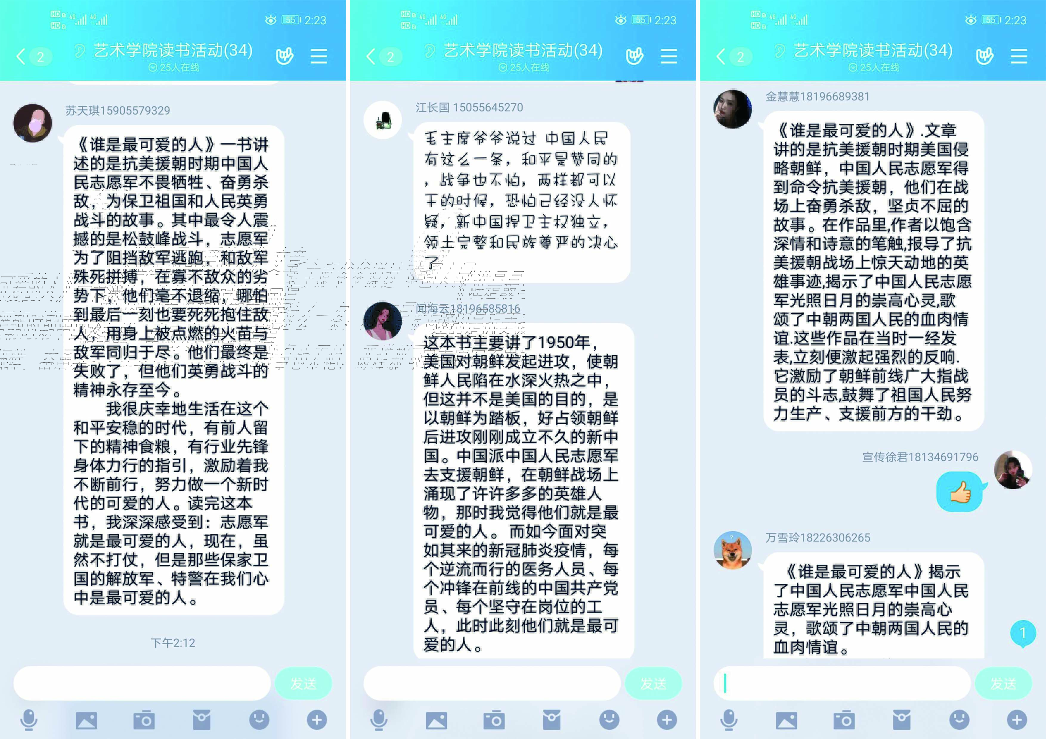 艺术学院2019级视觉传达设计2班举行了线上读书活动,本月分享书籍为《谁是最可爱的人》,热情讴歌了中国人民志愿军在抗美援朝战场上的英雄事迹。活动开始主持人发言,介绍了本次活动的流程,包括读书分享、事迹分享等环节。随后由班级成员依次分享了各自的读书收获,很多同学结合了疫情期间的一些感人事件进行交流,活动氛围十分浓厚。最后主持人进行了活动总结,呼吁大家一起珍惜现在来之不易的幸福生活,缅怀革命先烈,向英雄致敬,牢记使命,奋发图强,做新时代“最可爱的人”。