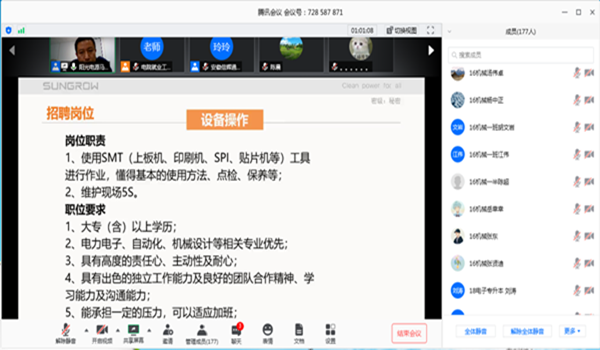 本网讯(通讯员:吴美红)为进一步推动线上就业服务的开展,积极搭建企业与毕业生供需见面平台,帮助毕业生顺利就业,4月29日下午,电子通信工程学院开展线上专场宣讲会,邀请阳光电源股份有限公司、安徽信辉通信技术有限公司两家单位为毕业生做专场宣讲,现场吸引200余名毕业生参加。