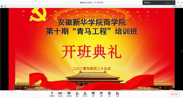 本网讯(通讯员:肖华君)为不断增强学生干部的思想政治素质、政治理论水平和创新能力,坚定青年跟党走的信念,确保疫情期间学生干部培训不掉队。4月30日,商学院第十期“青马工程”培训班通过线上腾讯会议平台举行开班典礼。商学院行政副院长徐志凤、学管秘书肖华君以及各社团、各班级学生干部带班参加了典礼。