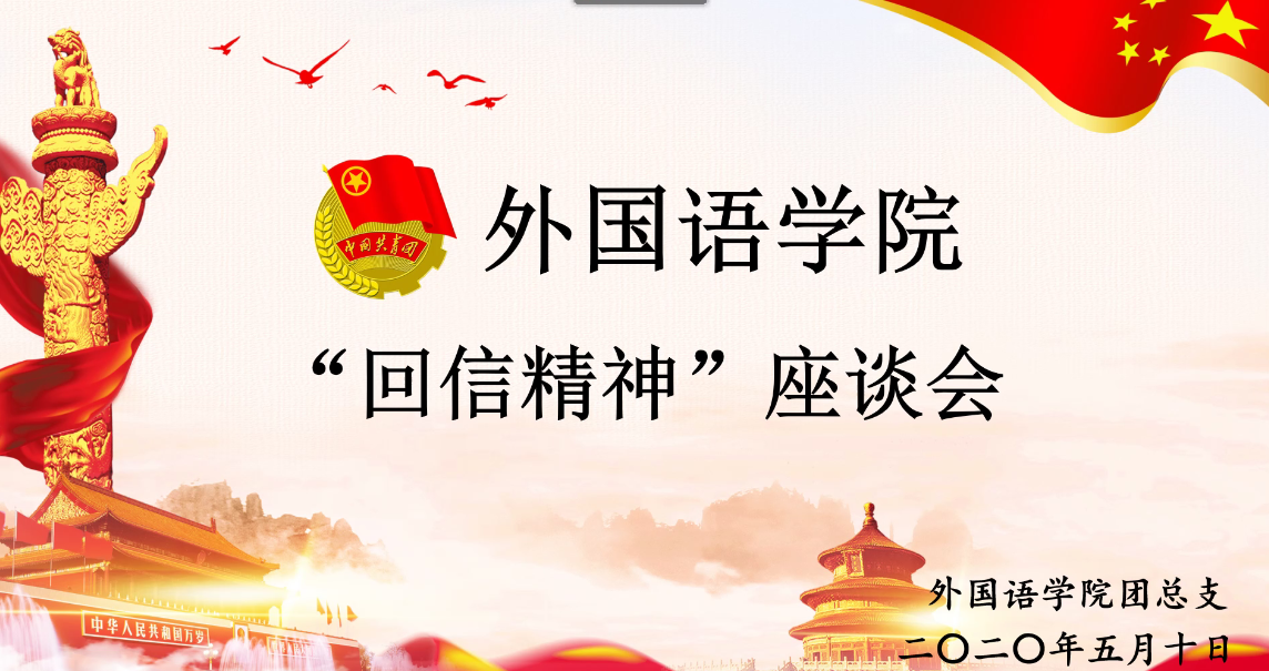 本网讯(通讯员:杨静)青春正当时,共筑中国梦。为弘扬“爱国、进步、民主、科学”的五四精神,激发同学们的爱国爱党热情,营造良好的校园文化氛围,外国语学院于5月10日晚举办“五四精神,传承有我”系列活动之“回信精神”座谈会。此次座谈会采用全英文模式,参会人员有团总支书记杨静、团总支副书记甄梦、组织部代表、宣传部代表、团支书代表,会议由杨静主持。