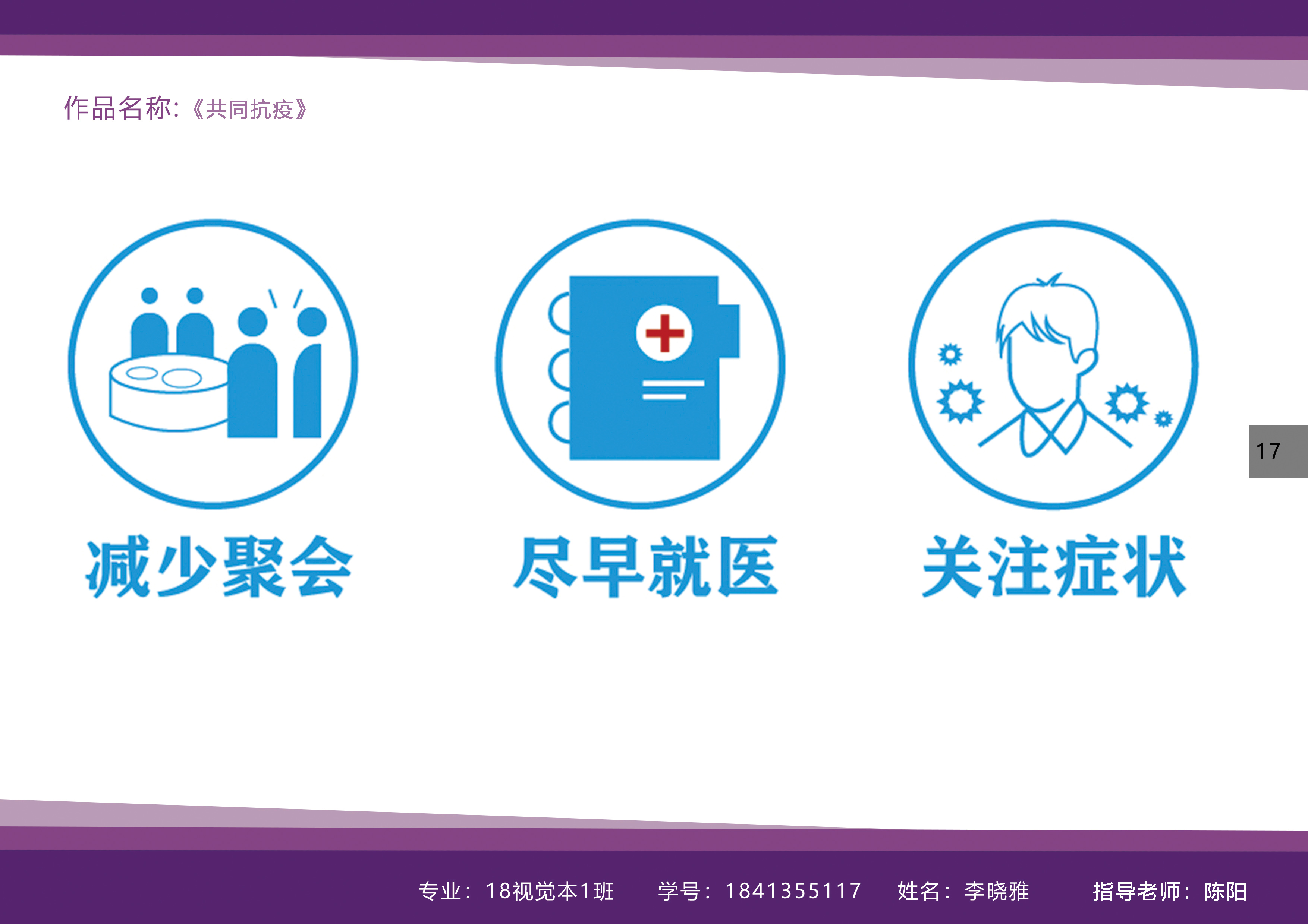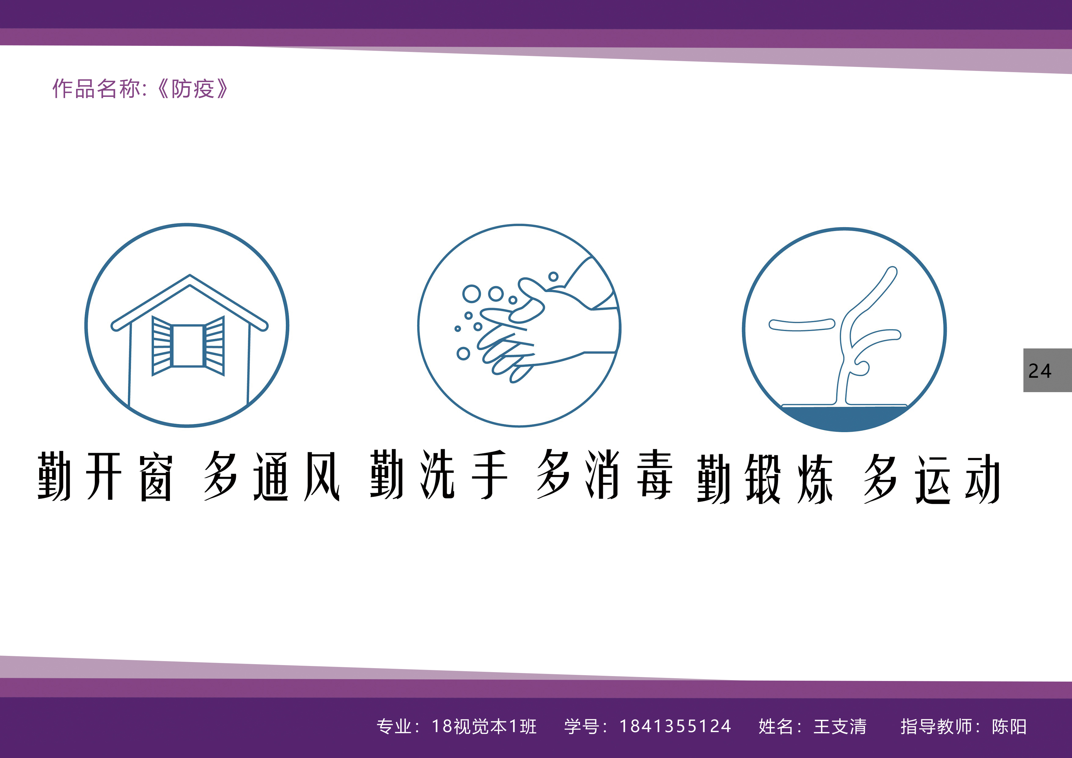 本次课程作品展是依据课程教学内容,将标志设计的相关知识点与防疫内容相结合,通过防疫标志的设计,将防疫知识进行了普及宣传。通过作品传达广大师生防疫的重点措施有加强锻炼、增强体质、提升抵抗力、做好个人防护等,应当坚持每日数次开窗通风,保持室内空气新鲜,尽量避免前往人群密集、空气流通不佳的场所。本次课程展出的防疫标志作品有三十余件,在展出的过程中,吸引了许多过往的师生,也起到了较好的防疫宣传作用,也是课程教学效果的集中体现,实现了“以展促教、以展促学、以展促改”的目标。