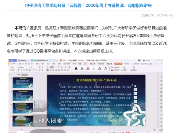 早在2月中下旬疫情防控、线上办公期间,学生考研成绩陆续公布时,在学院领导的指导下及时建立了电院2020年考研调剂和复试指导交流群,根据学生报考的专业为学生安排了专业教师对接,解答学生关于调剂、复试等一系列问题。做到教学、学工联动,形成一支强大的考研帮扶团队,针对考生的自身特点及报考情况进行针对性指导。同时邀请华园考研中心老师进入群聊,为考研学子加油助力,解疑答惑。
