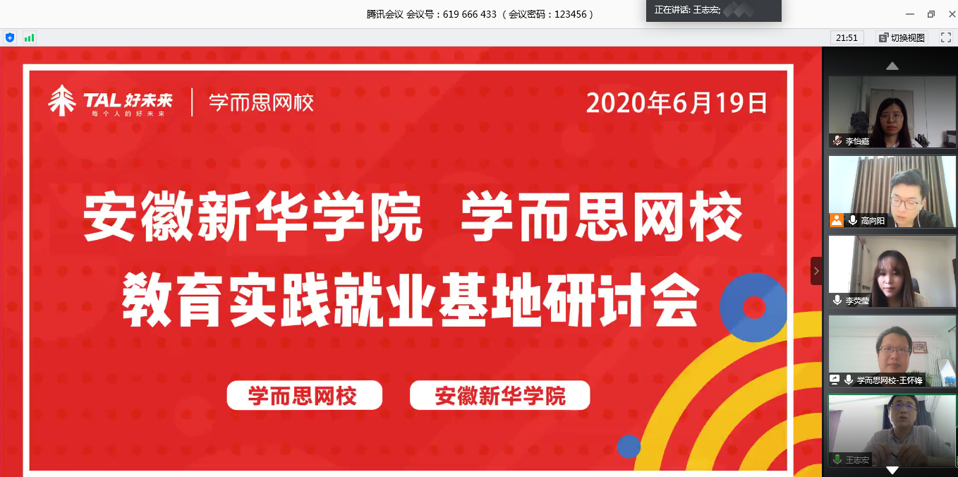 本网讯(通讯员:李怡嘉)为了进一步落实产学研创新工作,外国语学院充分利用腾讯会议等平台搭建的“云端会客厅”积极开展校企合作线上洽谈。2020年6月19日下午14:30, 经过前期周密安排,外国语学院与北京学而思教育科技有限公司举行了校企合作视频洽谈会,会议主要围绕“教育实践就业基地建设”这一主题展开研讨。参加会议的主要人员有:外国语学院副院长王志宏、英语系副主任周晓春、英语系主任助理盛素雯、产学研秘书李怡嘉,学而思网校校园资源部高级经理谢冰、校园资源部经理王怀锋、主管李荧莹和主管高向阳,会议由李荧莹主持。