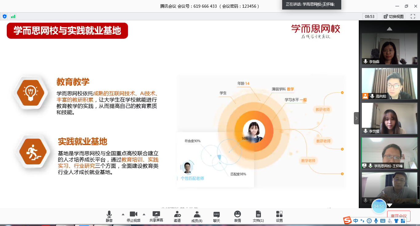 会议伊始,王怀锋结合好未来集团的发展及布局对北京学而思网校的基本情况作了介绍。学而思网校立足在线教育,秉持科技赋能教育的理念,打造特色的“直播+辅导+AI”三师教学模式。学而思网校致力于与全国重点高校联合建立人才培养成长平台,通过实践就业基地的建设,从教育培训、实践实习、行业研究三个方面,全面建设教育类行业人才成长就业基地。