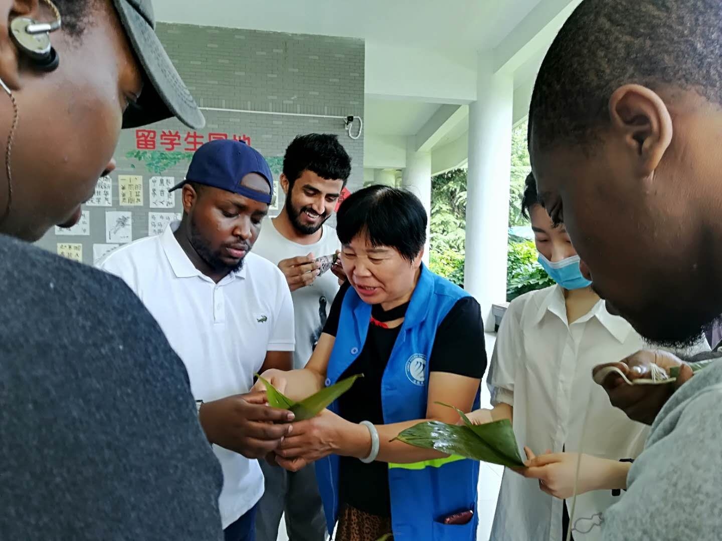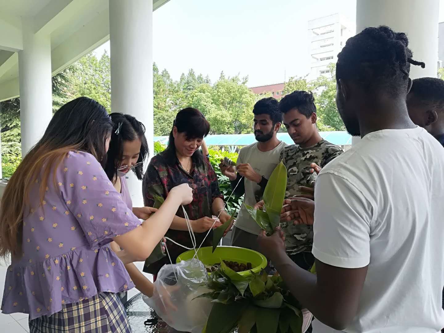 随后,中外学生们一边品尝着新鲜美味的粽子,一边举行了小范围的联欢活动。大家各自展示了自己拿手节目,有的弹吉他,有的跳民族舞,有的唱歌。大家一起度过了一个特殊时期的端午节。来自巴基斯坦的木尚是第一次体验包粽子,他说,包粽子的过程很有趣,端午节让他感受到了浓浓的中国情,同时也对中华传统文化产生了浓厚的兴趣。中国学生宋长彪说,虽然这次特殊原因不能和家人一起过节,但是在学校感受到了大家庭的温暖,感谢学校和老师们精心安排,大家过的很开心。