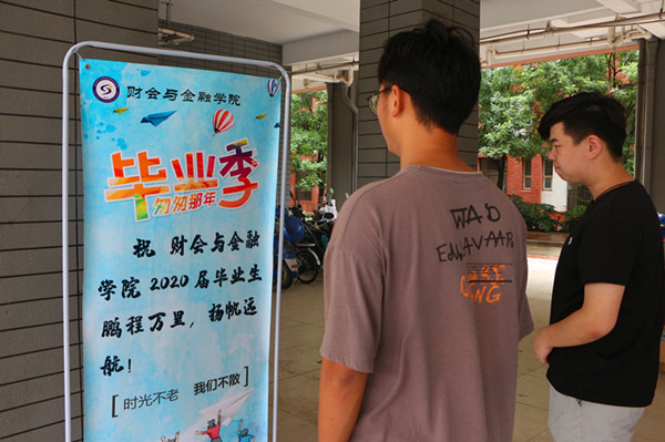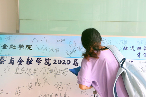 由于疫情,本次毕业生返校、离校显得有些仓促,但是财会与金融学院尽可能地为毕业生营造舒适暖心的环境氛围,现场准备了毕业生留言板,为毕业生送上“云祝福”,毕业离校现场安全有序。