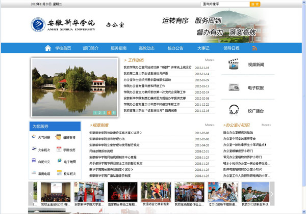 此次网站改版,新增加了办公室“运转有序、服务周到、督办有力、落实高效”的服务宗旨;校广播台、电子院报、魅力合肥、视频新闻等特色宣传版块;校办公告、领导日程等针对性服务版块;高教动态等关于高校研究的版块,办公室小知识、校车班次、值班安排等服务办公室工作人员的便捷版块。