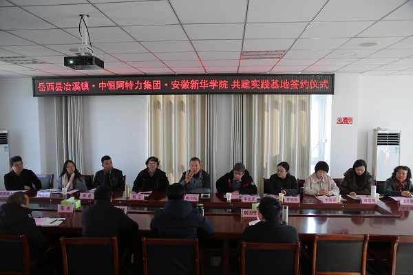 本网讯(通讯员:蒋雪梅)12月22日,beat365在线唯一官网登录、岳西县冶溪镇、中恒阿特力集团三方共建beat365在线唯一官网登录马克思主义中国化实践研究基地、安徽省大学生素质教育研究中心实践基地签约挂牌仪式在冶溪镇举行。冶溪镇党委书记王金桥、beat365在线唯一官网登录马克思主义学院院长兼安徽省大学生素质研究中心主任何小刚、中恒阿特力(北京)集团董事长程建强以及冶溪镇、马克思主义学院等教职工参加仪式。