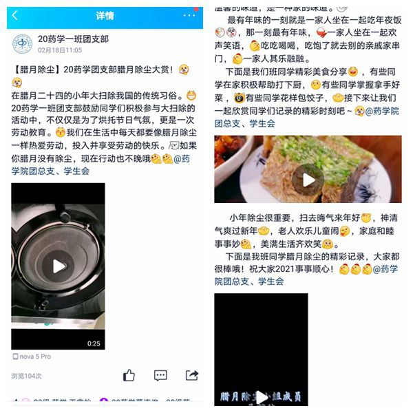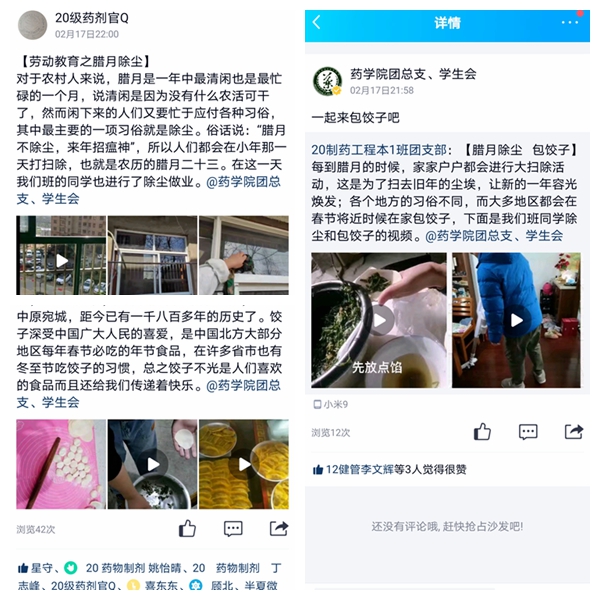 活动期间,同学们以班级为单位用视频以及图片展现自己的劳动成果。和家人一起进行腊月除尘活动,在除夕当天贴春联、做年夜饭,和父母一起包饺子,在假期进行志愿实践活动,体味父母的艰辛,感受劳动的快乐。同学们在劳动中培养习惯,在劳动中学会感恩。