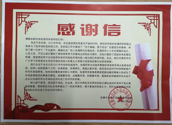 本网讯(通讯员:赵影、张然)2021年年初,全国疫情形势依旧刻不容缓的情况下,beat365官网药学院2019级药品经营与管理专业学子张潘积极参与一线防疫防控工作,被当地抗疫一线新闻报道。近日,安徽中合农产品市场有限公司给学校寄来了真挚的感谢信。