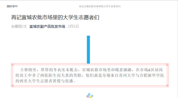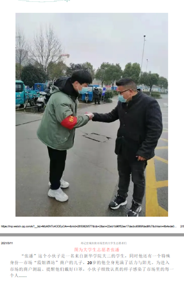 张潘主动放弃寒假休息时间,主动自愿参加安徽中合农产品市场一线抗疫,站岗一站就是数小时,姿态挺拔热情有礼,测温时认真仔细,规范亲切,空闲时还帮助商户和市民答疑解难。他没有因为疲惫而懈怠,也没有因此而骄傲自满,始终保持着高度的耐心与微笑,张潘就像寒夜里跳动着的青春火苗成为市场里最靓眼的青春风景线,温暖着市场、点缀着市场、扮靓着市场。