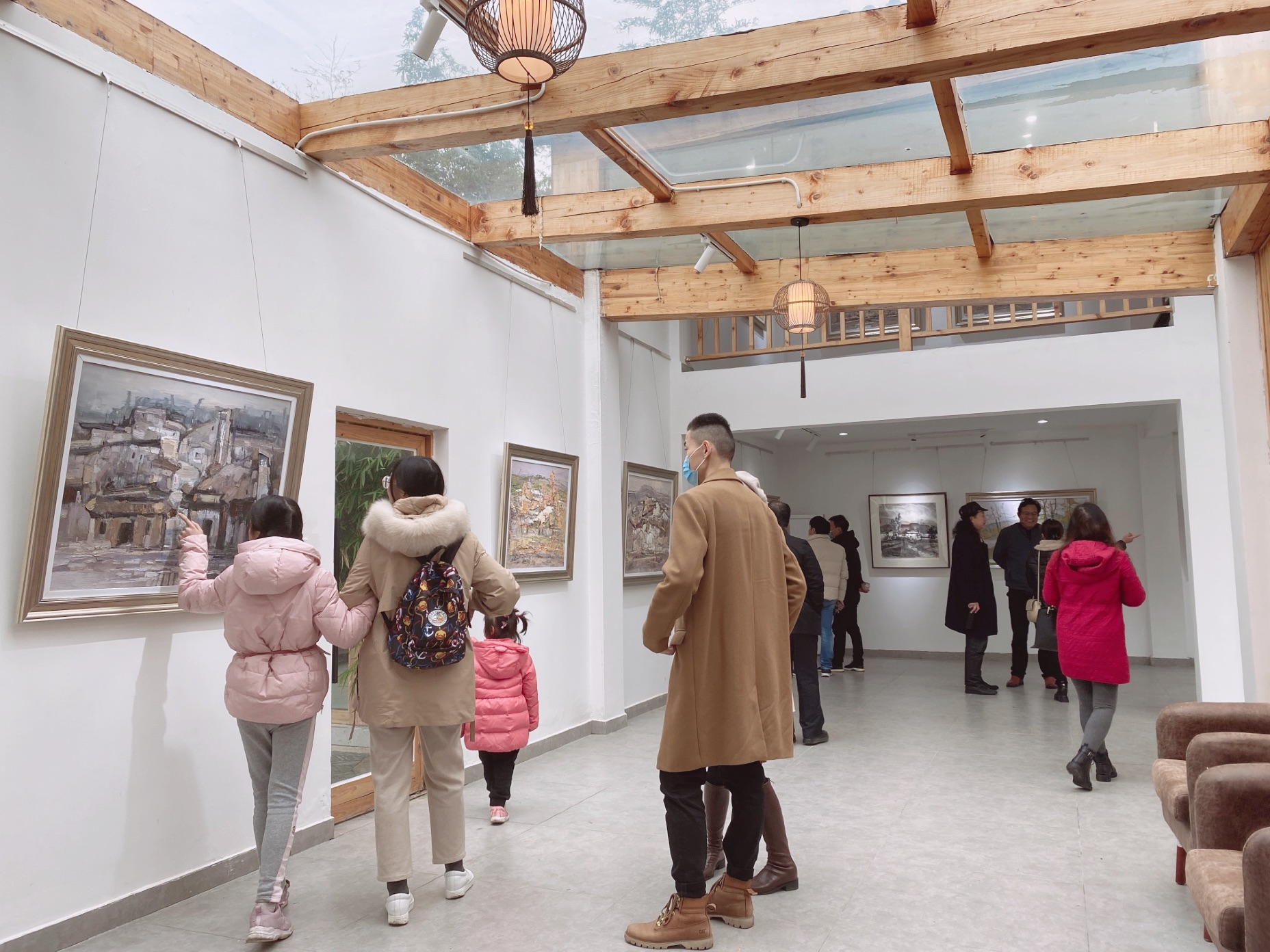 开幕式后,参会人员到三瓜公社文化小院展馆观看画展。展馆人头攒动,络绎不绝。此次展览共展出刘国宏先生49幅作品。作品围绕“徽州”主题,回归自然,将山野原始的质朴纯真表现的淋漓尽致,隐含着画家本人对徽州的深厚情感。