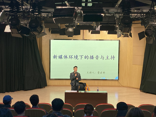 在分享会中,曹君骅老师首先讲述了传统媒体播音发声及语言塑造的特点,并通过自身的经验分享了在新媒体时代下结合各年级阶段所学习的方向、目的和要点,在讲座最后,曹君骅老师耐心亲切的和同学们分享互动,针对大一、大二和大三年级的学生通过工作岗位中的实务演练进行现场的指导和交流。