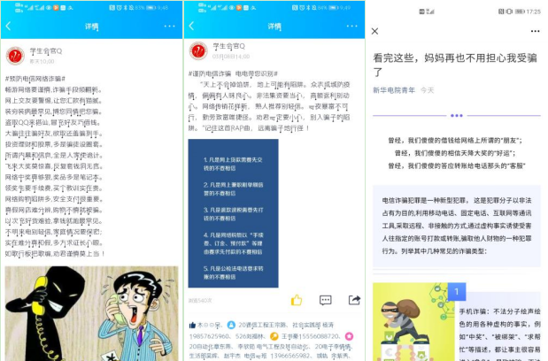 活动期间,电子工程学院/智能制造学院利用官方QQ和微信公众号向全体学子传播防范电信诈骗知识。通过学院官微、官网等新媒体平台加强防范电信诈骗宣传教育力度。通过微信公众号推文,介绍常见的电信诈骗形式及手段,通过大量案例分析示警同学们轻信、冲动、大意、贪念带来的不良后果,加强对同学们识别诈骗方法、防范诈骗技巧的培训。开展微课学习,引导学生通过移动端进行防范技能学习,使学生安全知识学习常态化、制度化开展。针对当前电信诈骗手段翻新、犯罪活动蔓延快等特点,学院还采取线上线下相结合的方式,扩大宣传范围,通过新媒体平台定期发布实用的预防电信诈骗方法,采用悬挂标语、张贴宣传海报、在LED显示屏多媒体播放反电信诈骗宣传片等形式,提高学生自我防范意识和能力。